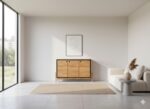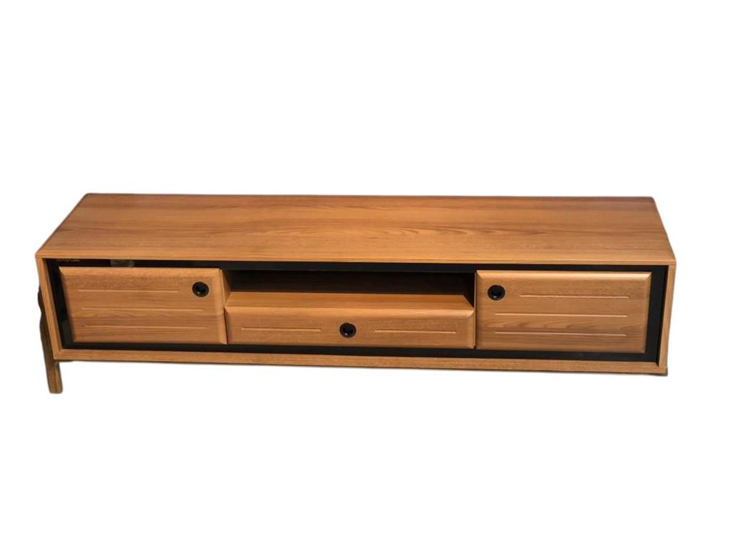 - میز تی وی از چوب با رنگ قهوهای روشن یا عسلی ساخته شده که جلوهای گرم و طبیعی به فضا میبخشد.